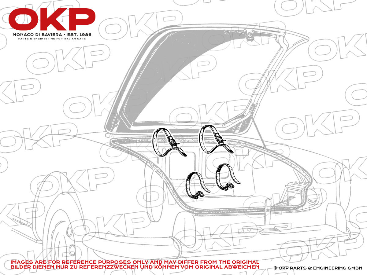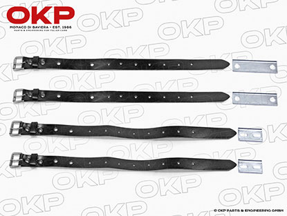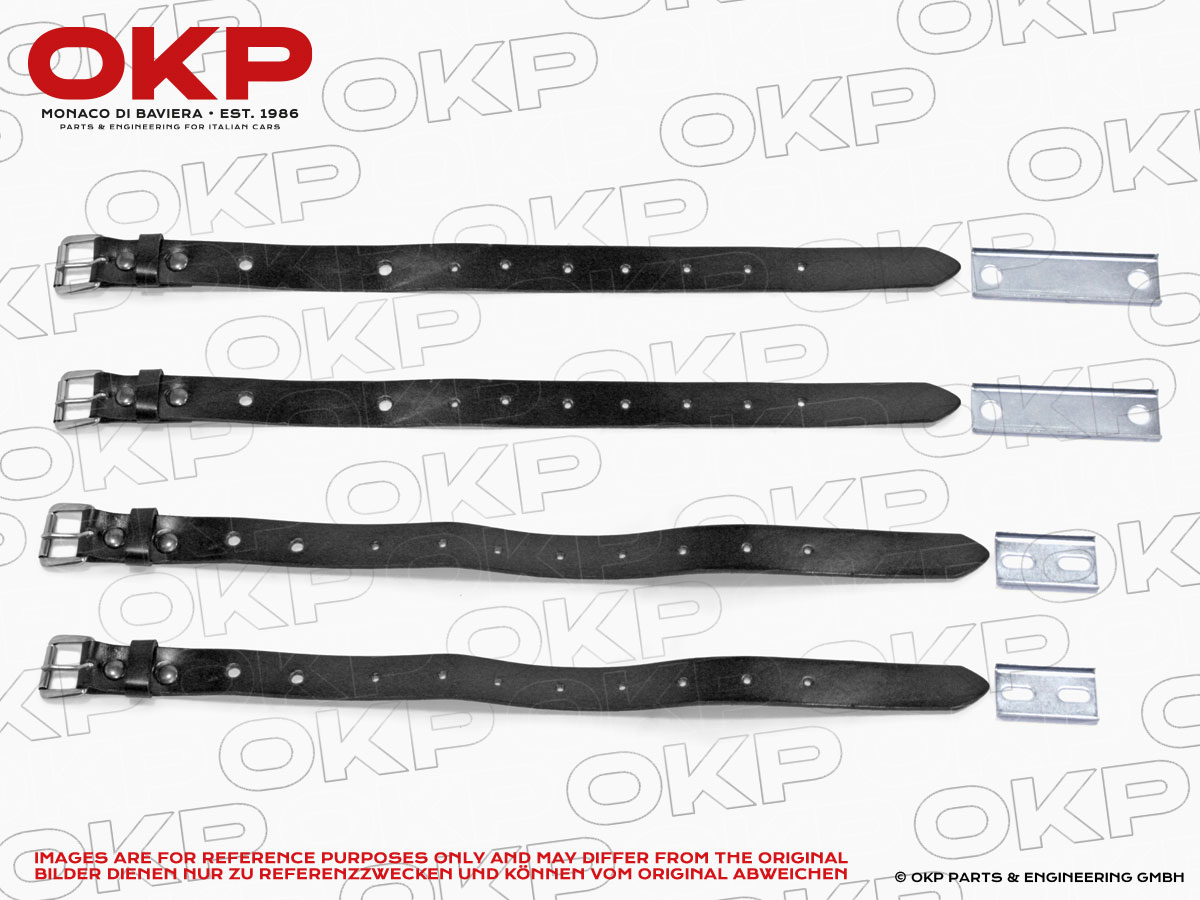 The set comprises 2x sets of 2x black leather straps, 2x sets of 2x black plated fixing plates